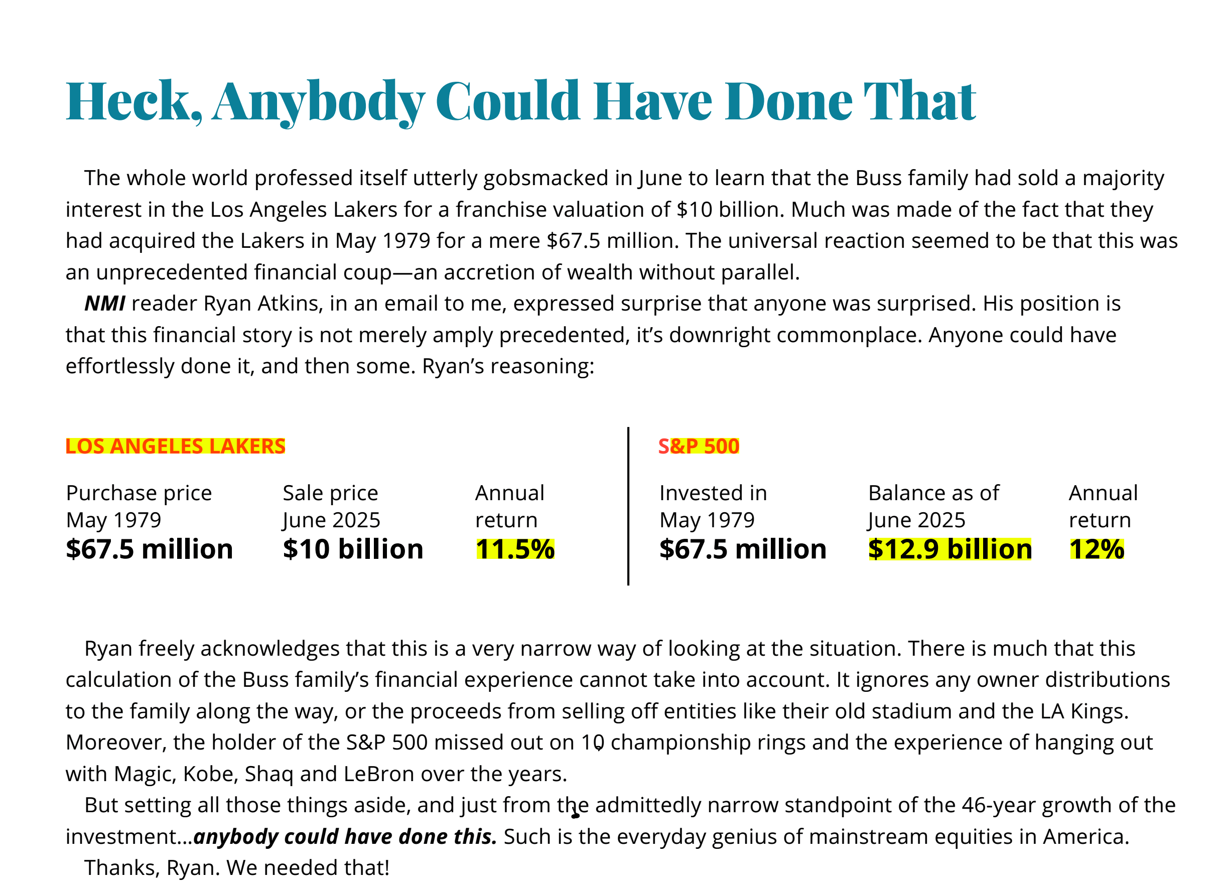 Buying and selling a famous sports team gets all the attention, but simply investing in the average of the top 500 American companies would have resulted in higher returns - without any work or stress.